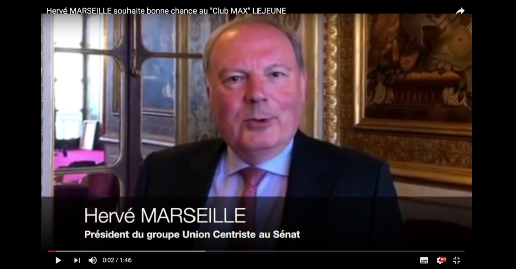 Hervé MARSEILLE, sénateur des Hauts-de-Seine, président du groupe Union Centriste au Sénat souhaite bonne chance au « Club MAX » LEJEUNE au travers d’une vidéo diffusée lors de l’Assemblée générale de lancement de l’association, le samedi 6 octobre 2018, salle des Carmes à Abbeville.